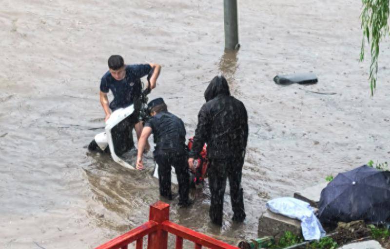 7月29日,北京市遭遇强降雨,通州区宋庄镇徐宋路积水越来越深。上午9时许,通州区小堡小型消防救援站消防员在积水路面进行排水作业、转移涉水车辆时,发现一名外卖小哥不慎跌入排水暗沟。小堡小型消防站的3名消防员迅速到达,发现水深约2米,该外卖小哥已完全跌入水面以下,身体上方还被电动自行车压着,情况危急。