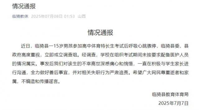 "近日,临猗县一 15 岁男孩参加高中体育特长生考试后呼吸心跳骤停,临猗县委、县政府立即成立调查组。